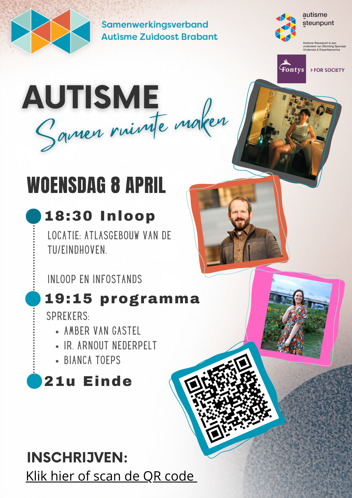 Op 8 april organiseren we samen met Fontys Hogeschool, SVA Autisme Zuidoost Brabant ons jaarlijkse gratis evenement voor iedereen die zich betrokken voelt bij autisme. Mensen met autisme, ouders, familieleden, professionals uit onderwijs en zorg…iedereen is welkom.